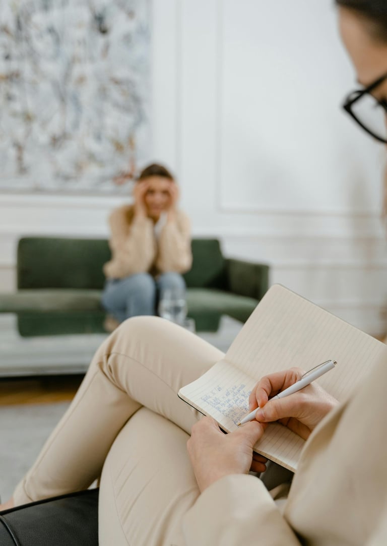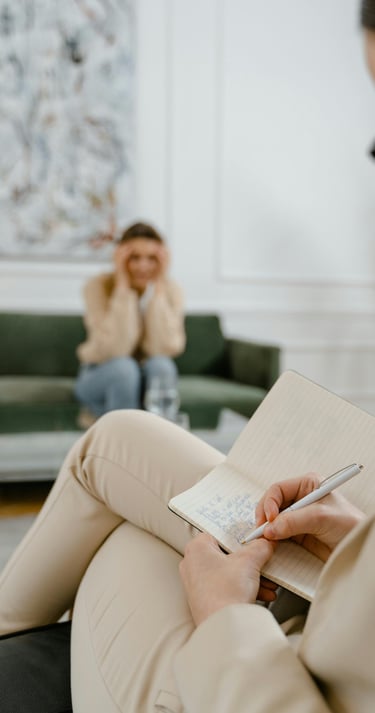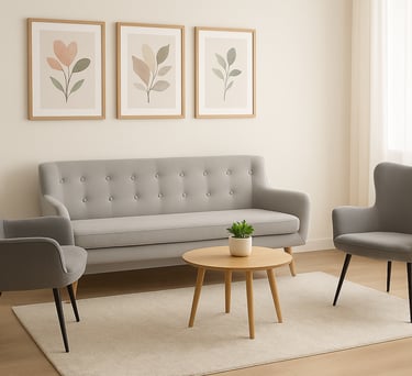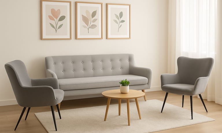🛋️ Gabinet gotowy do pracy — kanapa i fotele, biurko, ciepłe światło, dobra akustyka, neutralny wystrój.